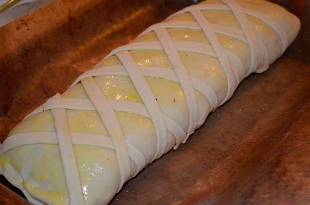 Далее загибаем ближний к себе край и заворачиваем как рулет. Края как следует защипываем. смазываем желтком и укладываем полоски крест на крест и сверху их тоже надо смазать желтком.