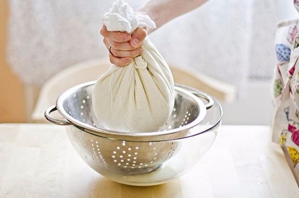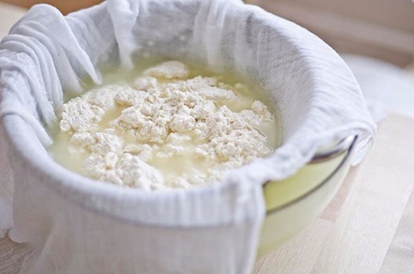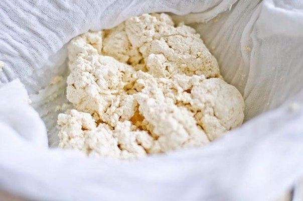 5. Остывший творог откидываем на дуршлаг, покрытый "вафельным" полотенцем или несколькими слоями марли. Таким образом мы сцедим сыворотку, и в ткани у нас останется творог.