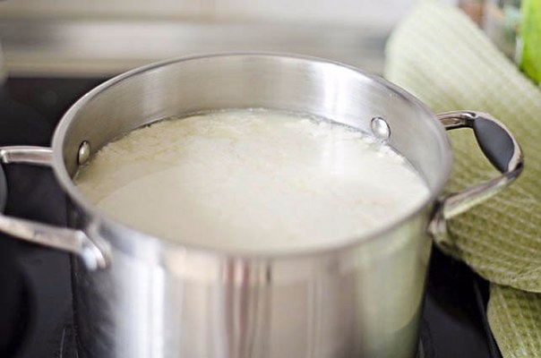 3. В процессе нагревания жидкость в кастрюле начнет разделяться на сыворотку и творог.