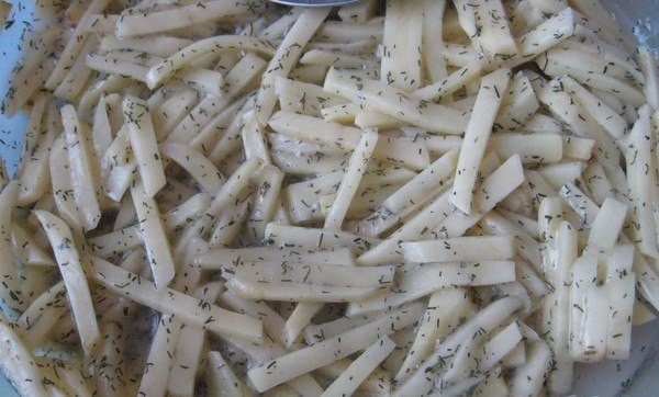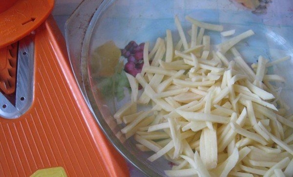 Далее приступаем к приготовлению корзиночек из картофеля, в которых мы будем сервировать нашу селёдочку. Рассчитываем по одной крупной картофелине на корзиночку. Очищенный картофель натираем на тёрке (как морковь по-корейски).