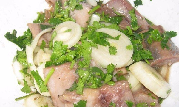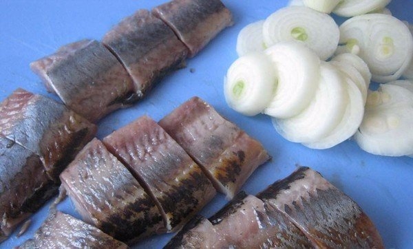 Солёную селёдку очищаем от костей, шкуры, разделываем на филе. Нарезаем селёдку на кусочки. Чистим лук, нарезаем кольцами.