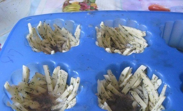 Формочки смазываем маслом, хотя они и силиконовые, лучше все же перестраховаться. И выкладываем картофельную массу, формируя из неё дно и бортики. Ставим формочки в разогретую до 200 градусов духовку на 30 минут.