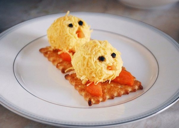 4) В заключении, занимаемся изготовлением аксессуаров «глазок», «лапок». Морковь нарежьте кружочками, а кружочки еще раз пополам. Два крекера выложите на блюдце, на них уложите «лапки», поверх сырные цыплята. Из оставшейся моркови делаем клювик, а из оливок глазки. Ставим блюдо в холодильник на 20-30 минут, после чего достаем из холодильника и подаем к столу.