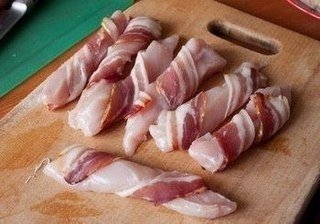 Каждый кусочек филе заворачиваем в кусочек бекона.