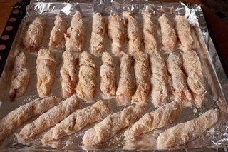 Обмакиваем в яйца и обваливаем в сухарях. Кладем на застеленный фольгой противень.