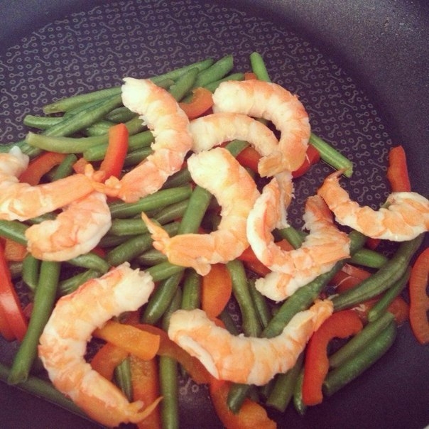 3) Затем добавляем креветки и вливаем соус. Накрываем крышкой на 2-3 минуты - соус должен немного загустеть