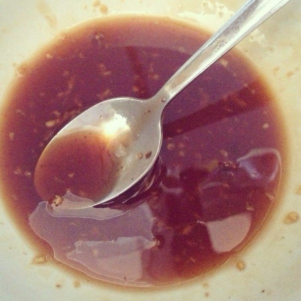 1) Делаем соус: выжимаем сок из имбиря чеснокодавилкой, также добавим в соус и немного мякоти, добавляем сливовый и соевый соусы, хорошо перемешиваем