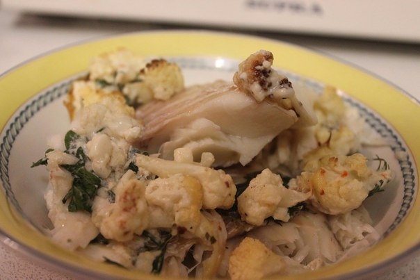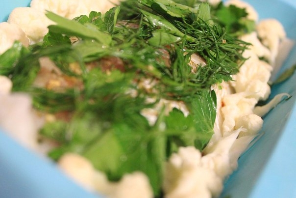 Рыбу разморозить, вымыть. В силиконовую форму выложить рыбу, посолить, засыпать зеленью. Цветную капусту разобрать на мелкие соцветия, промыть водой, положить поверх зелени.
